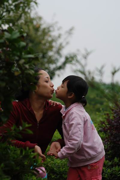 照片描述:摄于2011年9月,沿江风光带,妈妈工作比较忙,在周末加班完之后赶到沿江风光带与女儿一起玩耍,见面后两人非常亲密,相互亲吻,表情十分陶醉。
