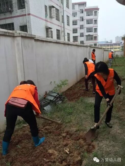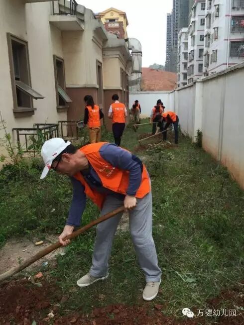 初春的围墙边,长满了杂草,一行穿着红马甲的万婴米兰家长义工,积极主动的投入到种植地的开垦中。。。