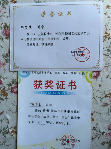 【宝贝简介】我是何万隽,万婴申奥幼儿园优秀毕业生,现就读于砂子塘小学二年级。我认真好学,宜静宜动,兴趣爱好广泛,在校期间,多次获评“儒雅学子”、“学习之星”、“三好学生”和“满分小状元”等荣誉称号,在各种社会实践中常获校特等奖,在省、市、校级各种围棋、钢琴、运动等项目比赛中屡获佳绩。我喜欢去看外面的世界,感知万物的奇妙,我喜欢用镜头记录一切美好的事物,今年4月我拍摄的蒲公英在长沙市中小学生校园文化艺术节美术比赛中获得了一等奖。