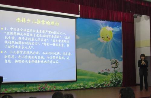 现我中心联合国家中医药管理局中华中医学会和中国亚健康服务中心为我中心会员和家长进行中医少儿保健知识系列公益讲座。讲座教会家长通过舌象、手像、大便、指纹等判断孩子的健康状况,及如何用少儿推拿的方式来解决孩子的各种不适症状。如咳嗽、发烧、厌食、腹泄等。