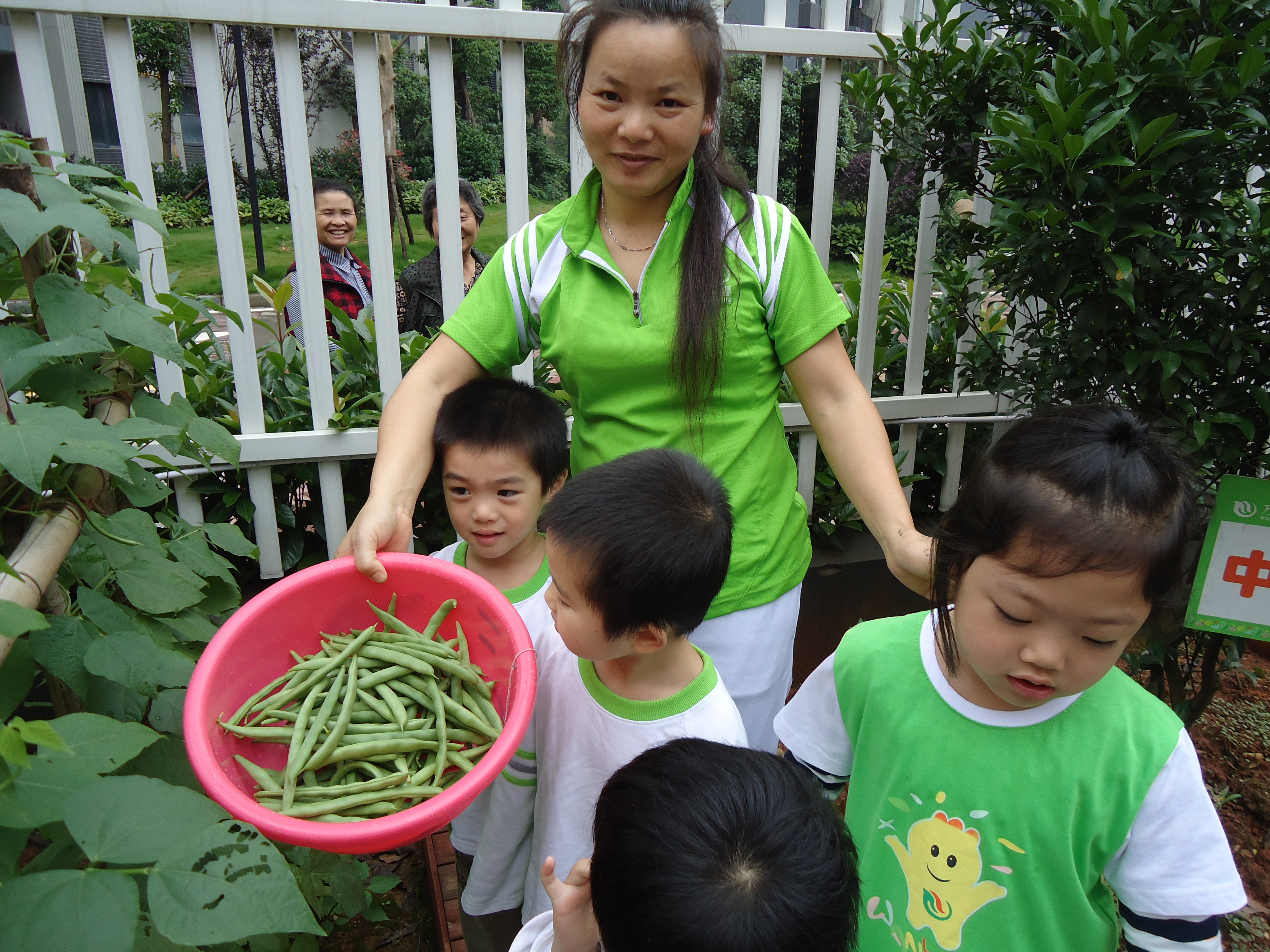 的“劳动成果”—疏菜。孩子们一边采摘豆角,一边不由自主的说“采摘真好玩儿,我长大了也要种许多