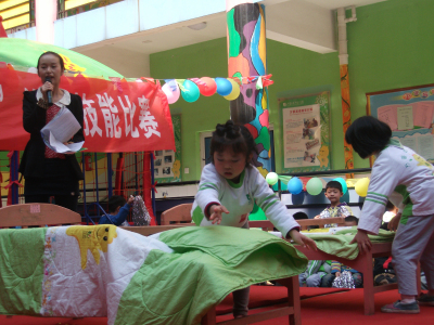 万婴东方园为更好的提高孩子们的生活自理能力,养成独立自主的好习惯,减少任何事情家长都为孩子包办代替的现象,在杨园长的带领下以保健医生、保育组长为首,东方园开展了一场别开生面的“万婴东方园第一届生活小能手”比赛。赛前,负责人的方案制定,场地的布置,人员安排,赛前的活动宣传,班级“生活小能手的初赛”以及邀请家长评委等等,东方园这个大家庭忙得热火朝天,不亦乐乎。比赛的项目多彩多样,根据不同年龄段的孩子而定。有小班孩子的穿穿鞋子比赛;有中班孩子的穿脱衣服、整理衣服比赛;大班孩子的洗碗,叠被子比赛。终于,在孩子、家长、老师的满心期待下,东方园首届“生活小能手”拉开了比赛的帷幕。比赛过程中,孩子们一个个不输于人,专心比赛。他们的童真感染在场的每一个人,他们所爆发出的能量让在场的家长觉得不可思议。,场上的专心比赛,场下的认真观看,为这小小的天使加油,打气······ “比赛结果已经无关重要了。我们更多的是关注孩子在比赛过程中的表现。我们看到孩子的成长和进步,我们很感动!希望幼儿园多举行这样的比赛。”这是一位家长评委发自内心的想法。