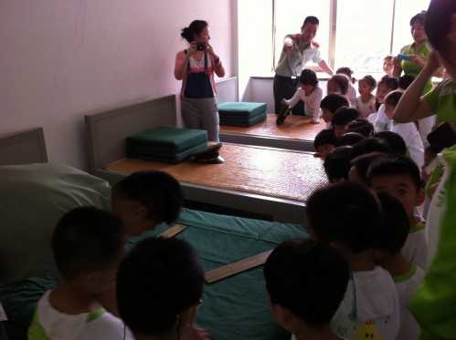 消防叔叔在教孩子们怎么把被子叠成豆腐状。