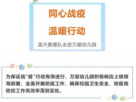 细心呵护,大爱护航。由衷感谢蓝天救援队默默的奉献,他们用自己的实际行动支持、抗击疫情,确保万婴幼儿园环境干净整洁,为孩子们筑牢筑实疫情防控墙。