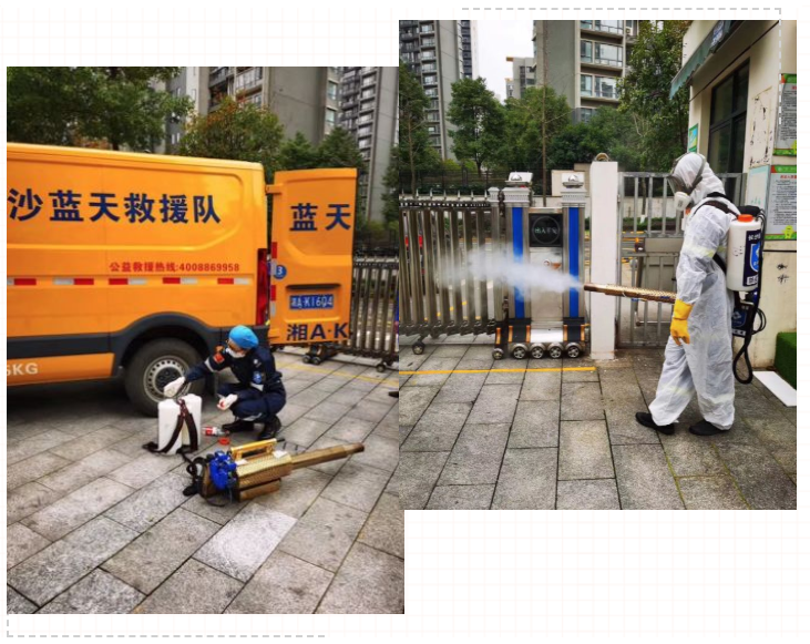 蓝天救援队的队员们首先认真了解校园内外布局,合理规划工作路线,穿戴防护服,再按照规范的消毒步骤,调配好消毒液,熟练地操作起喷枪。