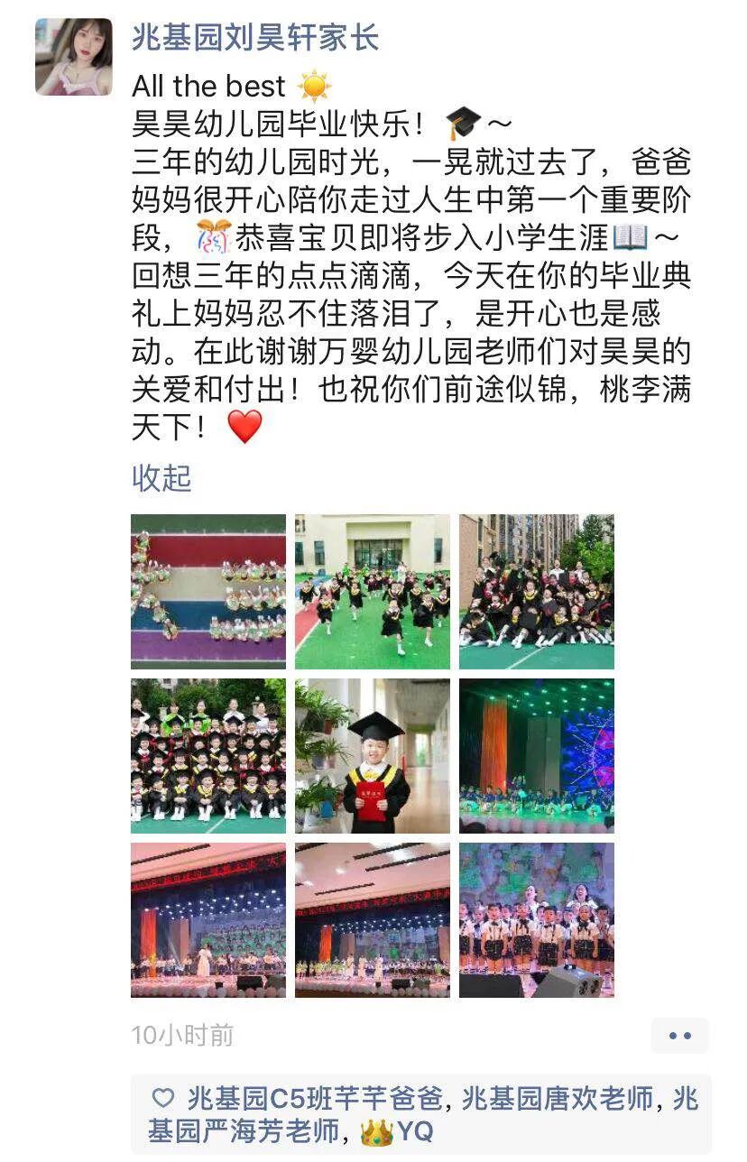 亲爱的孩子们,虽然你们幼儿园毕业了,但是,幼儿园三年的师生情永存,三年的同学谊不变。万婴兆基幼儿园一定是你们永远最温暖的回忆。