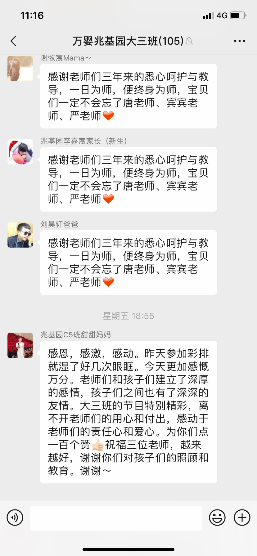 亲爱的孩子们,在过去的时光里,你们在幼儿园里,就像一个个轻盈跳跃的小音符,快乐地歌舞、游戏、画画、听讲故事、朗诵儿歌、探索未知。刚刚进入幼儿园时的你们,有的哭、有的吵、有的闹。而今天站在我们大家眼前的你们,个子都长高了,知识都丰富了,你们和老师们架起了深厚的友谊之桥!亲爱的孩子们感谢你们的爱、感谢你们带给我们的快乐!你们活泼可爱的形象---和甜甜的童言童语将留在我们老师的记忆里,成为我们老师回忆时讲不完的话题。