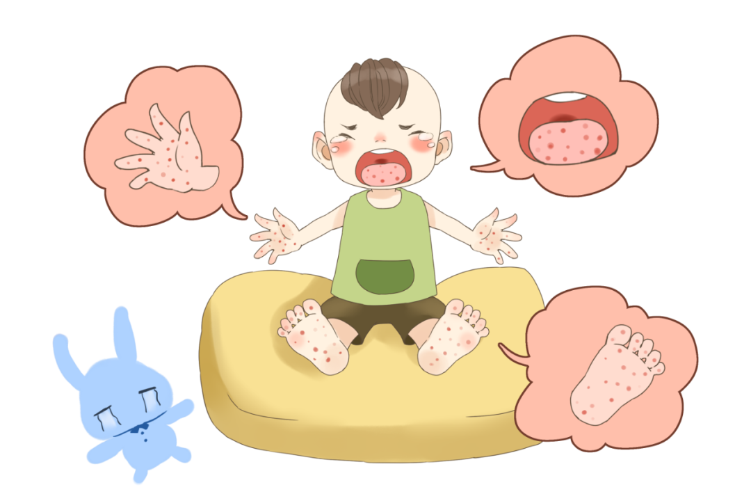 主要症状:先出现发烧症状,手心、脚心出现斑丘疹和疱疹(疹子周围可发红),口腔粘膜出现疱疹和/或溃疡,疼痛明显。部分患者可伴有咳嗽、流涕、食欲不振、恶心、呕吐和头疼等症状。