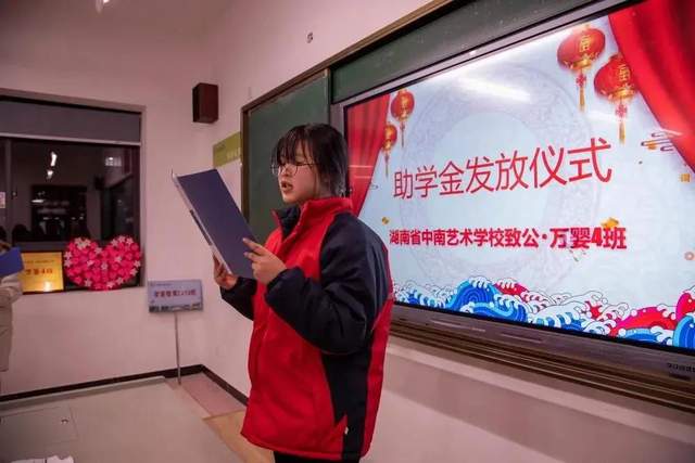 ▲2020年12月23日晚,湖南省中南艺术学校致公•万婴4班助学金发放仪式举行。