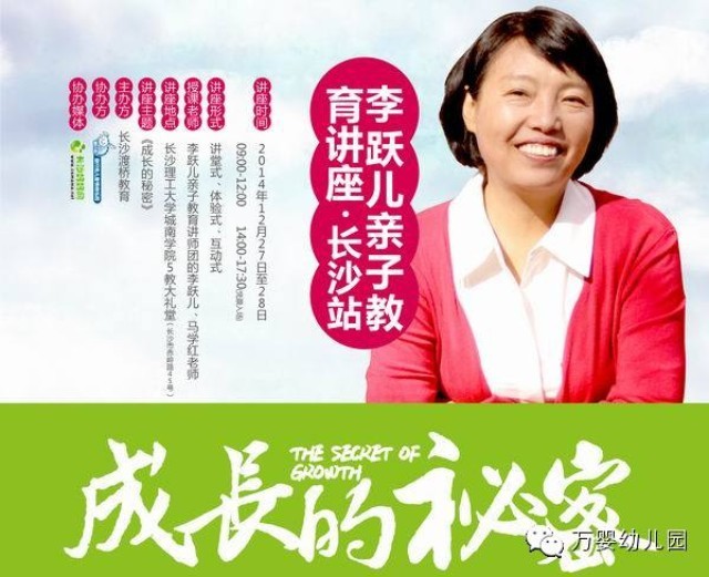 12月27、28日国内知名亲子教育专家李跃儿老师亲临长沙为大家分享《成长的秘密》!李跃儿教育理念的核心是“孩子是脚,教育是鞋”,每个孩子都是独一无二的,都有各自的特点,身体发育不尽相同,心理发育也不尽相同,如果父母都能学会观察自己孩子,了解自己的孩子,便能更好地为孩子的成长起到好的助推力。孩子的教育上,父母起到决定性作用,虽然社会的改变需要一个过程,很缓慢,甚至需要几代人的努力,但父母可以通过学习成长,改变自己的理念,给孩子更适合的家庭教育,为孩子的成长保驾护航!