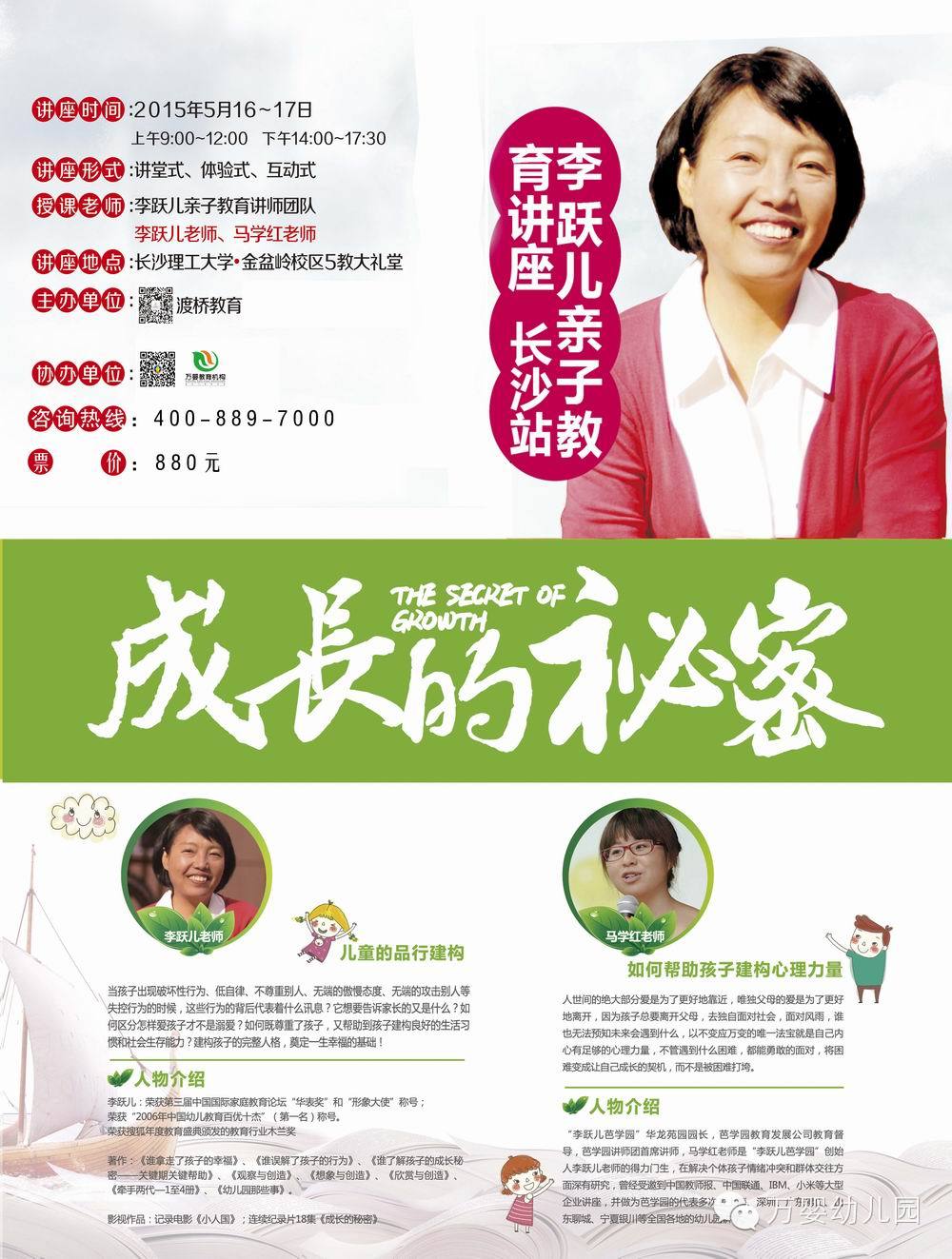 因此,孩子成长过程中,早期教育的重要性不言而喻。为此,我们特别邀请全国的知名幼教专家李跃儿老师、马学红老师为大家全面解读孩子,共同陪伴孩子幸福快乐的成长!于2015年5月16——17日在长沙理工大学举办《成长的秘密》讲座,欢迎各位家长朋友积极参与,学习和提高教育的理念方法,为子女的未来打下一份坚实的基础!