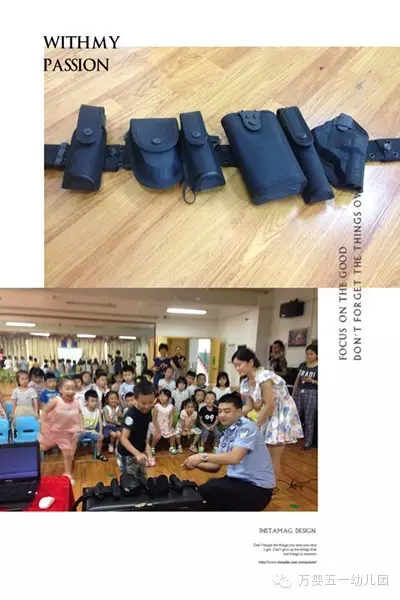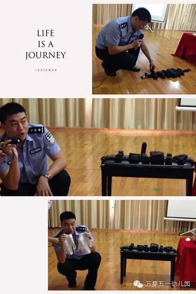 为为爸爸在给孩子们一 一讲述警察随身携带抓坏人的有哪些工具,有哪些用途。从未见过这些的孩子们听得聚精会神,还时不时发出惊叹:“哇,太厉害了!”。