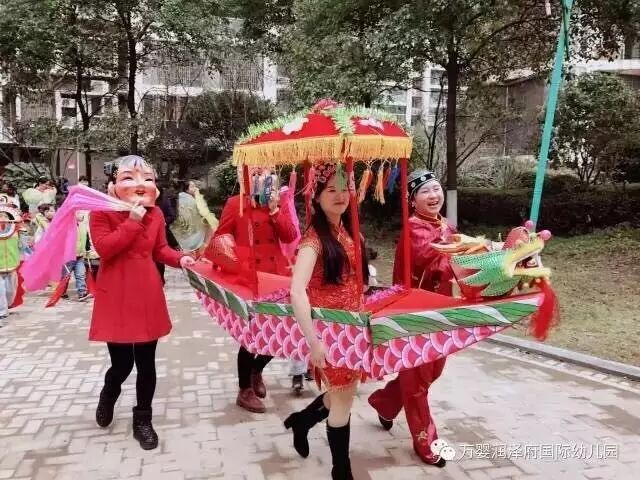 划旱船也称跑旱船,就是在陆地上模仿船行功作,传说是为了纪念治水有功的大禹。表演跑旱船的大多是姑娘。