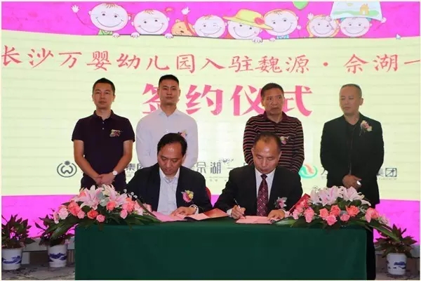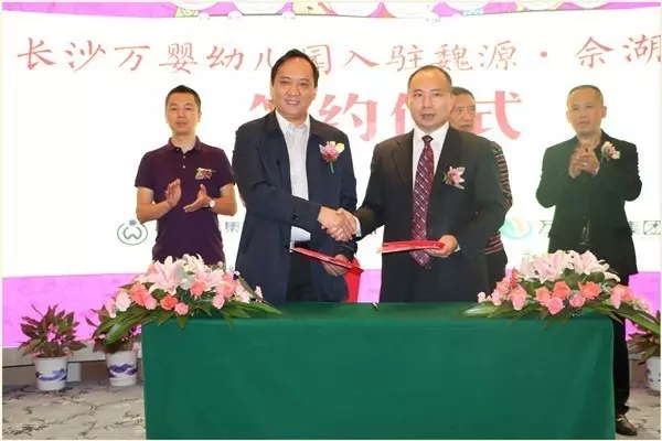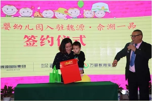 2016年10月20日,万婴教育集团在邵阳市魏源国际酒店与魏源·佘湖一品举行了签约仪式,万婴教育集团董事长黄平先生、魏源集团董事长刘亚林先生出席了此次签约仪式,并分别发表重要讲话。两位都表达了对儿童早期教育的关注和支持,以及双方就强强联手未来的看好。参加此次签约仪式的还有双方的相关领导、魏源·佘湖一品业主代表、媒体人士。签约现场还进行了由业主参与的抽奖活动。