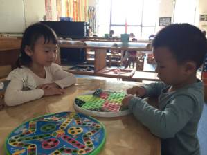 区域游戏开始了,涛涛一个人在下棋区,他拿了一副五子棋,他将棋盘摆好,一个人拿出棋子有模样地排列着棋子,不到两分钟,涛涛将五子棋收起来,边收边说:“这个一点都不好玩。”于是又拿了一副跳棋出来,但也不知如何玩耍,因为这需要两个人一起玩,而他只有一个人。老师:“你为什么不去找好朋友和你一起下棋呢?”于是涛涛过去邀请了图书区的优优和他一起玩。一直到区域游戏时间结束,两人始终能遵守跳棋的规则,并且玩得很开心。