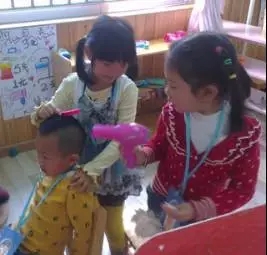 客照照:“您满不满意?”小顾客开心地点点头。教师又拿起电吹风,一边给顾客吹头发,一边嘴里发出“呜——呜——”的声音。在一旁的琳琳看得津津有味。“素洁,轮到你来理发了。”于是,素洁开心地、充满自信地模仿老师的动作和表情给下一个顾客理发。这时候的理发店充满了温馨和热情的气氛。