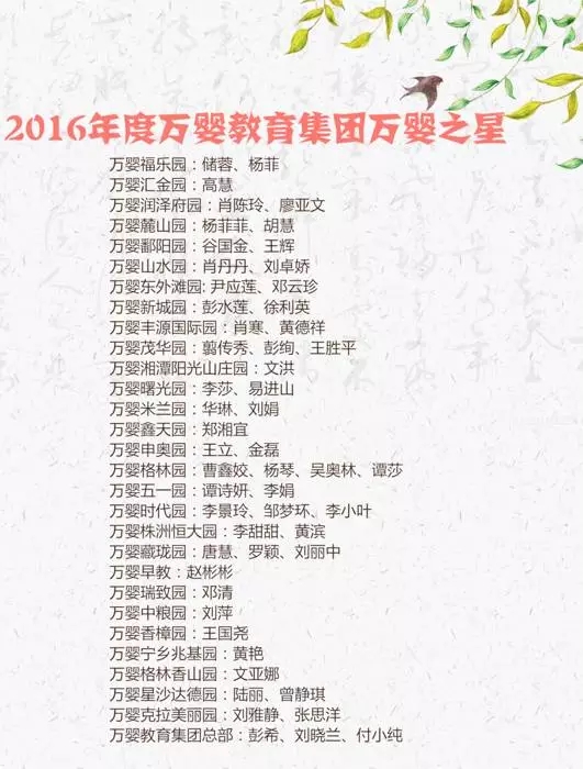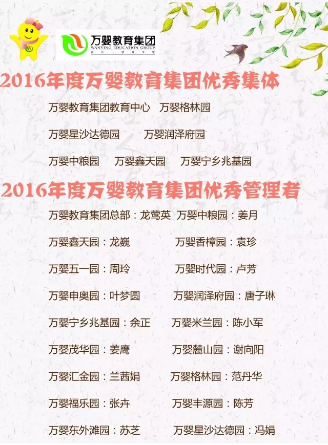 能获得此殊荣我首先要感恩的是命运,一直以来都觉得我是一个非常幸运的人,不管到了哪里都有贵人相助,感恩命运让我遇到了万婴这个充满教育情怀,充满正能量的大家庭。我是2015年11月份正式入职万婴,在这一年多的时间里最要感恩的是我所在的两个团队,第一个就是总部教育中心,是黄平董事长让我转变思维模式:“遇到任何问题,都会有3种以上的解决办法”,是李斌老师让我充满专业热情,是周隽老师让我知道什么是遇事冷静,宽容大度,是龙莺英老师让我知道什么是贵族性思维,是邹玲辉医生让我知道什么是默默无闻付出,是万婴这个领导团队让我认识到什么是一群人影响一群人,我已经深深地被这样一个充满专业热情、充满正能量的集体所影响。第二个就是万婴香樟艺术幼儿园,是刘依娜园长让我知道什么是豁达、接纳、遇到问题及时解决雷厉风行的办事效率,是园务班子让我知道什么是团结、沟通,心往一处使的力量,是老师们让我感受到什么是真实的感动和关心,感恩我在万婴所有的遇见。