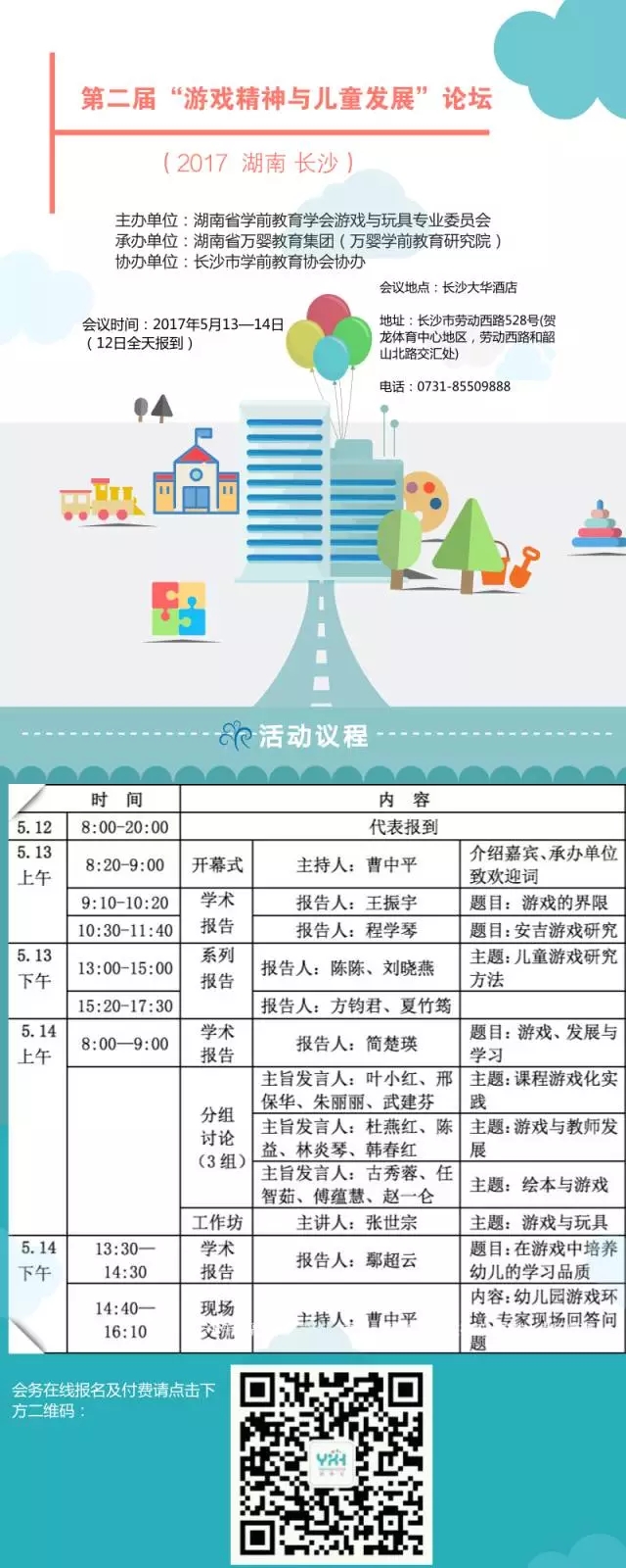 第二届“游戏精神与儿童发展”论坛(长沙,2017)将于2017年5月13-14日,长沙大华酒店盛大举办,30余位身处中国学前教育领域的顶级专家、学术技术带头人、学前教育专家库核心专家,以及300位幼教领域的教育者工作者将参与此会。