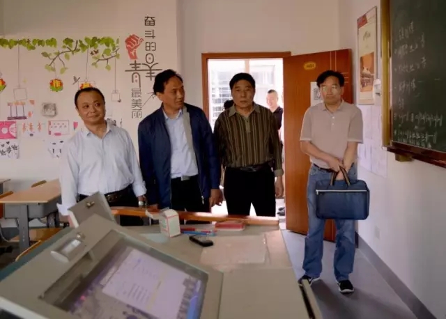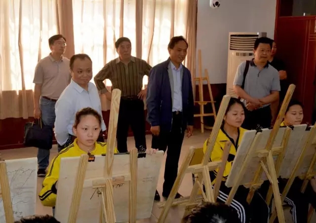 图为省厅领导在黄平校长的陪同下旁听学生美术课