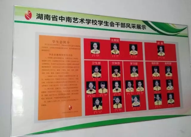 图为湖南省中南艺术学校学生会干部风采展示栏