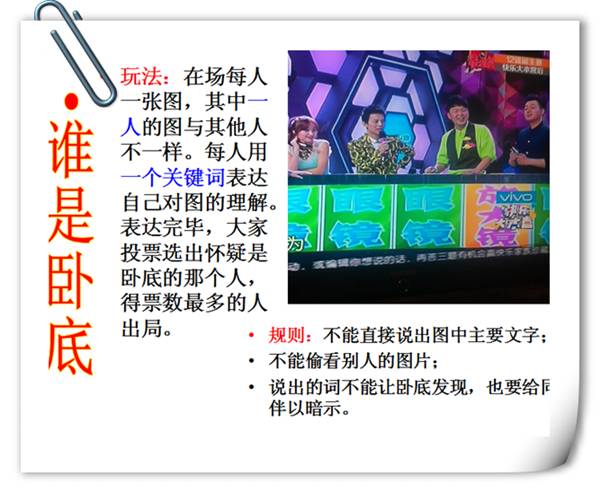 我也喜欢看快乐大本营。当老师提到里面一个最热门的一个游戏时,异口同声一起说了出来《谁是卧底》。讲师带我们玩了这个游戏并以这个游戏介入了与我们的主题有关绘本《爸爸,妈妈》我们就像小朋友一样参与其中。游戏告诉我们一样的图画,不一样的想法,正是契合幼儿心中想表达的方式。