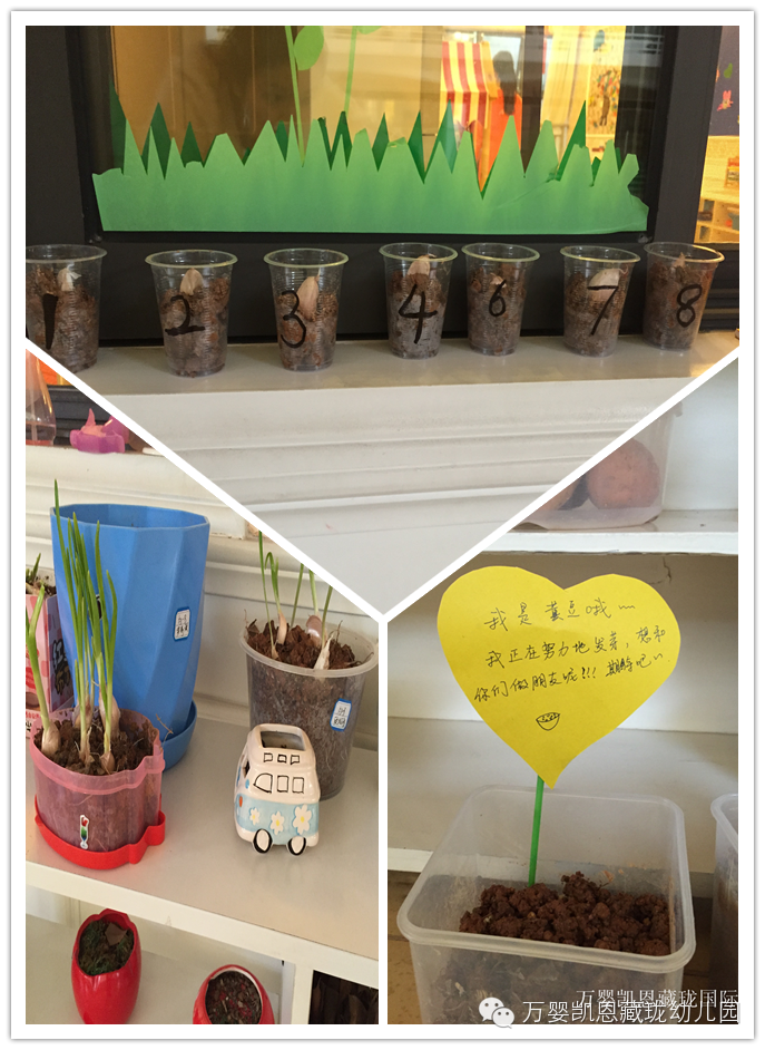 哇,经过我们的细心照顾,植物迅速生长,各班的植物角里春意盎然:大蒜长出了长长的蒜苗,小麦也吐出了新的嫩芽...