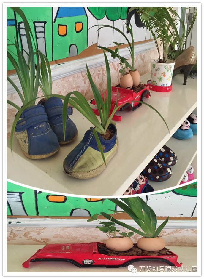 不穿了的鞋子,玩坏了的小汽车、鸡蛋壳等在这里都变成了充满艺术感的花器,创意不错吧?