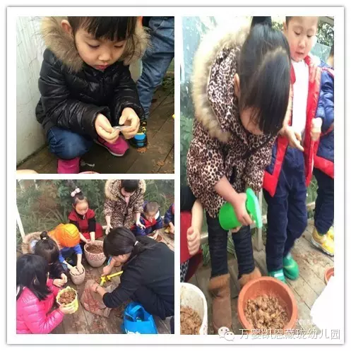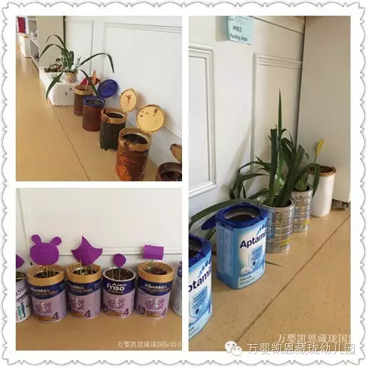 瞧这些可爱的奶粉罐,也被我们利用起来了。我们还为罐子的表面涂上了一层颜料,为它们重新穿上了“花衣”。