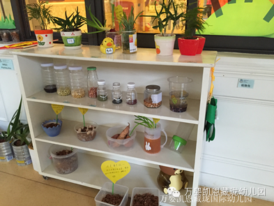 我们利用废旧的塑料瓶、饮料瓶等装上泥土或者放上水,然后亲手栽种了大蒜、白菜、土豆、小麦、黄豆等植物,每天来园都先到植物角看看,及时给植物加水,观察植物的变化。