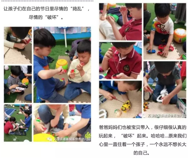 儿童最喜欢的游戏就是“搞破坏”,他们借此释放情绪,探究玩具内部的神奇,再自行重组创造。可以说“拆装家用电器”对他们来说具有深深的吸引力。但是在日常生活中,孩子的这种行为常常是不被允许和接纳的。我们希望借此机会,让孩子们自己的节日里尽情的“捣乱”吧!