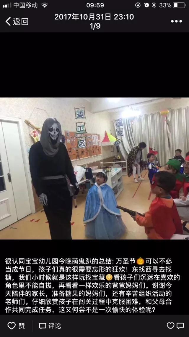 看点 01 当当当! 万圣节来了 万婴凯恩米兰春天幼儿园的宝宝们 在昨天晚上,化身为“萌鬼” 和老师父母欢聚一堂 来了一次万婴奇妙夜之旅。 晚上6点30分,忙碌了一天的宝爸宝妈,带着萌娃们准时应约。 哗!幼儿园的节日氛围,实在太足啦。南瓜灯,骷髅头,门口悬挂着僵尸,阵阵恐怖音乐,从音乐厅传出来,胆小的孩子,吓得想哭脸有木有。 主题活动终于开始啦。一开始的“阴曹地府狂欢秀(T台秀)”,大家有模有样,列队入场,大摆POSE,酷帅到不行。 到了“群魔乱舞”,大家就完全放开了,家长和宝贝们,仿佛置身于一个魔幻的世界,嗨到不行。“萌鬼带你去寻宝”,更是妙趣横生。当萌宝宝带着爸爸妈妈,在操场、楼道各个角落,寻找糖果时,总是会遇到好多孤魂野鬼。这时需要有勇有谋,才能逃出险境,重新寻宝啦。 符咒贴贴贴、挑逗幽灵、僵尸跳跳乐、发掘木乃伊…… 十来项“萌鬼闯地府”游戏,激发了家长和孩子们的闯关欲。每个家庭都齐心合力,团队作战,在手脑并用、开怀大笑之余,收获了一个富有趣味的奇妙之夜。 为什么要过万圣节,为何要组织“萌鬼趴”?让万婴凯恩米兰春天幼儿园告诉你。万圣节是欧洲的鬼节,和我们传统的中元节一样,这个节日,也源于对生命的敬畏。和中元节不一样的是,他们的仪式,充满乐趣。西方人认为,10月31日是夏天正式结束的日子,也是严酷的冬季开始之时。死去的人,会在这一天回魂。而活着的人因为惧怕死人夺魂,会熄掉炉火烛光,让死人的魂灵无法找到活人,又把自己打扮成妖魔鬼怪把死人的魂灵吓走。之后,他们燃起火光,开始新的生活。万圣节,是对生的歌颂,对万物有灵的人间的歌颂。这种节日的寓意,十分积极达观。万婴过万圣节,更富意义的一点是,它是一个超级欢乐趴。在趴体里,孩子们享受游戏、独立思考,也与父母团结协作,共同闯关。这与万婴的教育理念,“让孩子做自己的主人,让孩子获得成为自己主人的能力;为孩子提供充足、优质的精神养分;还给孩子生动的生活世界”,是十分契合的。Halloween is a strange holiday,but we love it!各位萌鬼,明年见。 一 萌鬼带你去鬼混