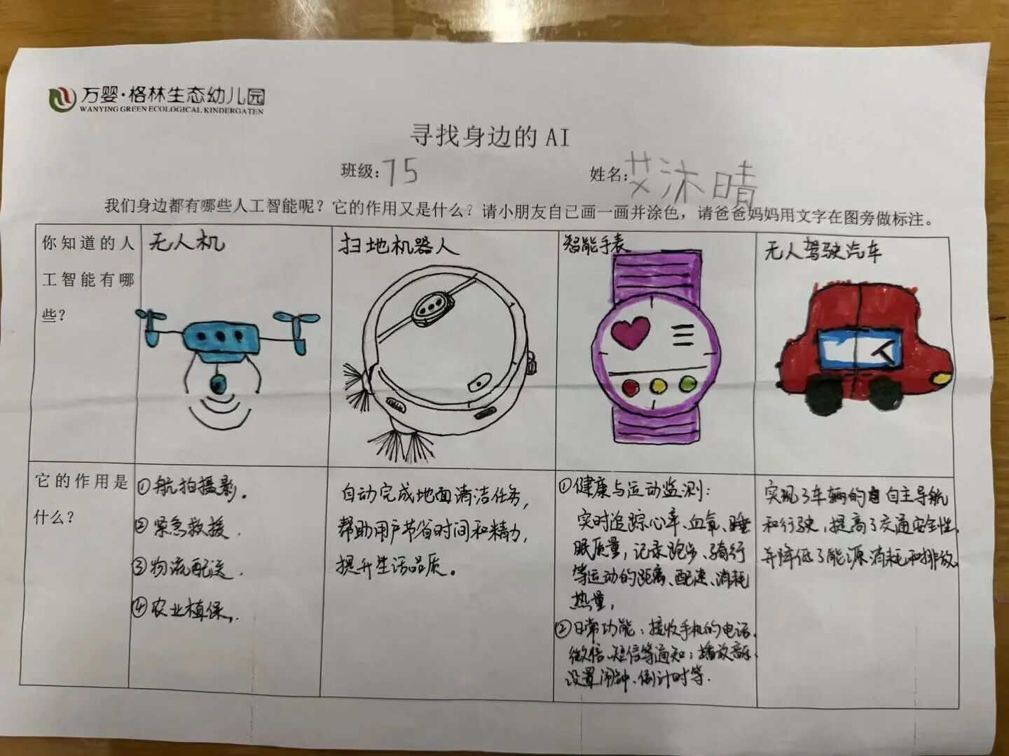 分享会上,大家的发现格外鲜活:沫航举着照片得意地说:“我家的智能锁不用钥匙,扫脸就能开门,太方便啦!”挖挖紧跟着补充:“它还能防小偷呢,坏人来了会报警!”予泽晃着调查表:“扫地机器人是AI,能自己把地扫干净,还会躲开我的玩具车!”毓麒蹦着喊起来:“天猫精灵会给我唱儿歌、讲故事,我睡不着的时候就喊它!”