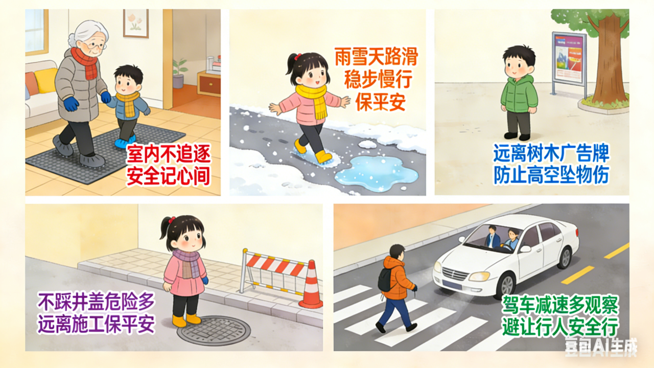 针对雨雪冰冻天气路面湿滑的情况,幼儿园提示骑行电动自行车接送的家长,务必与孩子一同规范佩戴安全头盔,减速慢行,避开结冰、积水路段;开车接送的家长需提前规划路线,预留充足时间,保持安全车距,谨慎驾驶,避免急刹车、急转弯,到校后即停即走,不占用消防通道和人行横道。同时,教育孩子过马路时走斑马线,遵守 “一停二看三通过” 原则,不闯红灯、不横穿马路、不猛跑打闹;为孩子准备防滑性能好的鞋子,步行时提醒孩子放慢脚步、稳步前行,避开路面坑洼、井盖和积水区域。