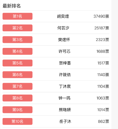 活动收获了师生家长的热烈参与,共有 151 位萌娃报名成为候选人,累计吸引 85922 人次参与投票助力。根据投票结果,活动评选出人气十强萌娃,胡奕煊以 37490 票位居榜首,何芸汐、樊煜怀分别获第二、三名,其余上榜的还有许可芯、贺梓墨等七位萌娃。