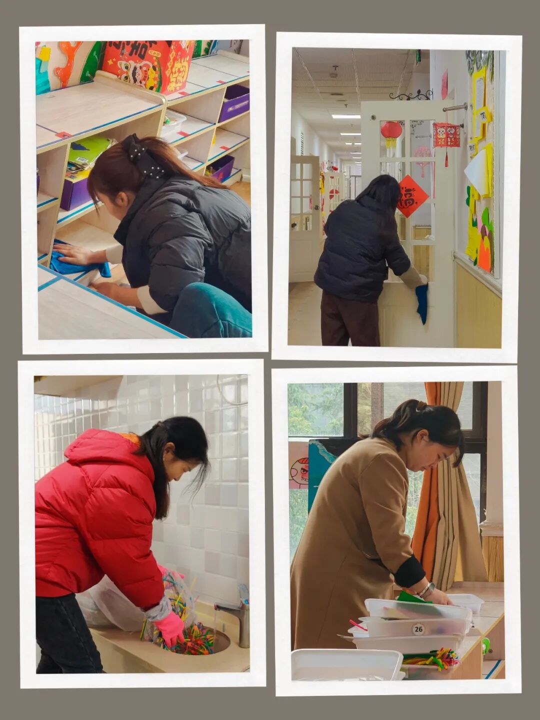 环境是无声的教育。为给幼儿打造干净整洁、温馨优美的园所环境,会议结束后,老师们立刻化身“清洁卫士”,奔赴各班开启大扫除。擦桌椅、洗玩具、拖地面,连书架缝隙、玩具角落都不放过;紫外线灯消杀、84消毒液擦拭、绘本阳光晾晒,每一步都严格按流程进行。每一处细节都精益求精。洁净明亮的教室、整齐有序的物品、焕然一新的环境,处处洋溢着迎接孩子们归来的温暖与期待。