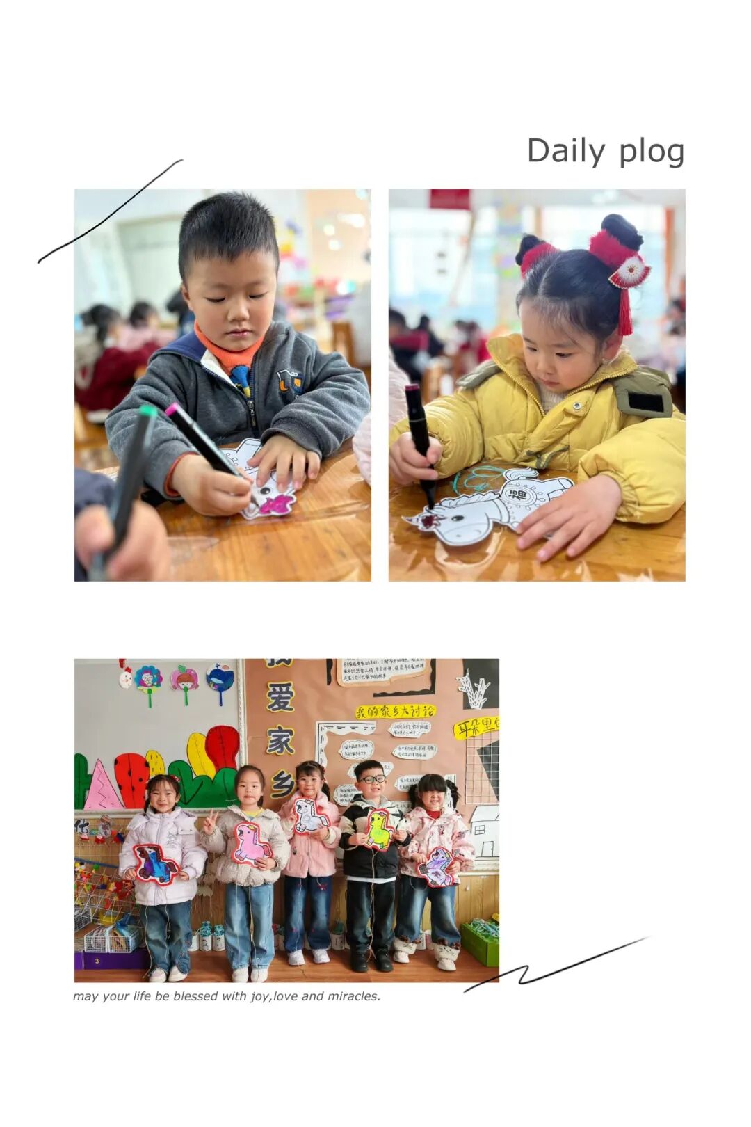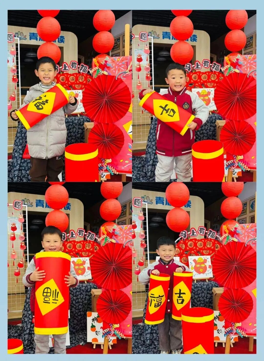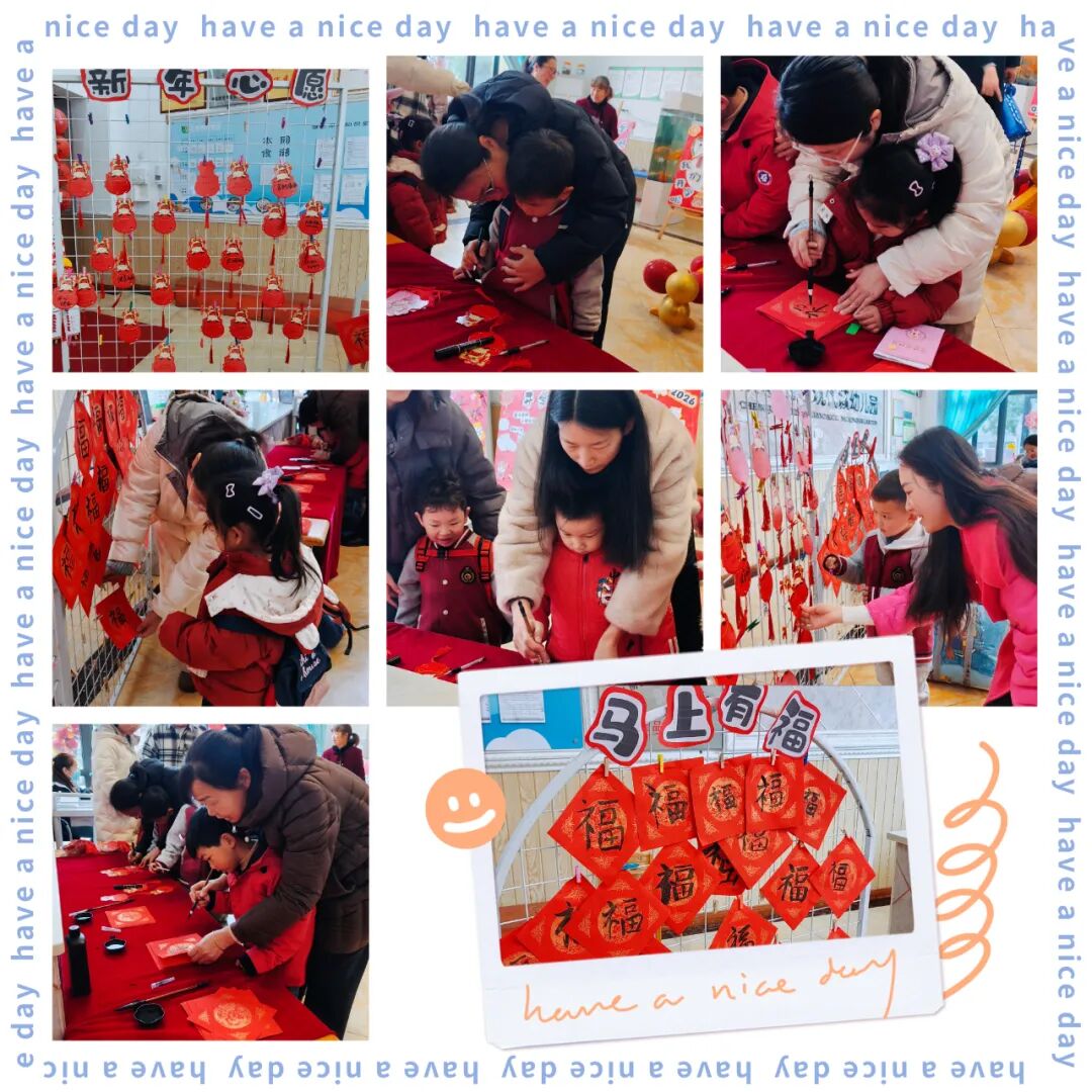红纸铺开来,孩子们用稚嫩的小手画“福”字,有的像小太阳,有的圈成小圆圈。“我的心愿是天天玩滑滑梯!”一张张心愿卡贴成爱心墙,把新学期的期待悄悄藏进字里行间。