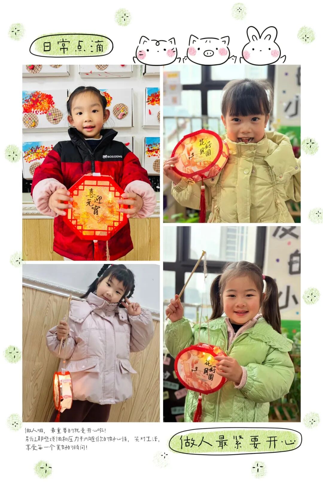 元宵节到啦,周二的教室变身“灯笼工坊”,小宝贝们一个个好专心,经过努力漂亮的灯笼就完成啦。