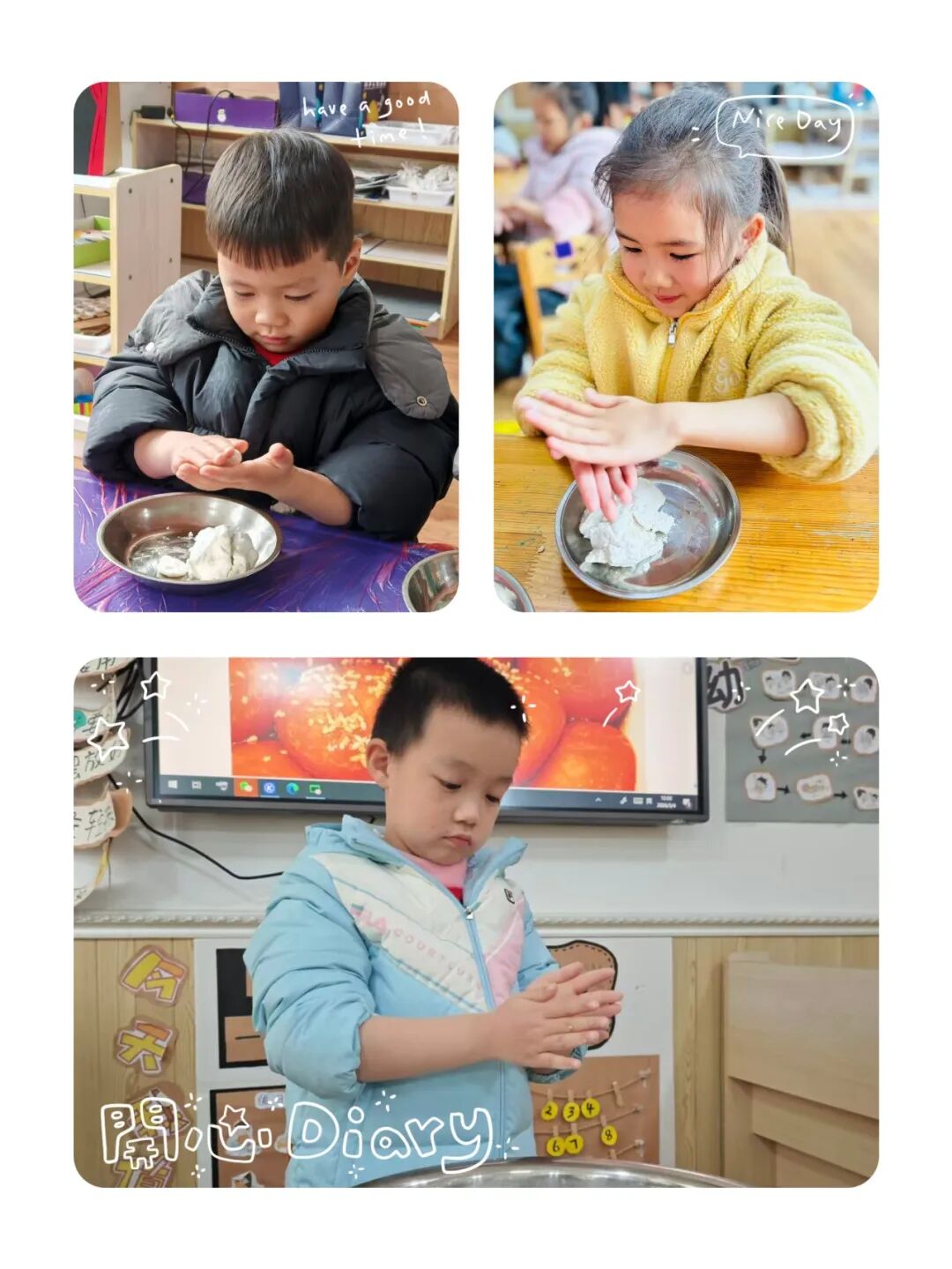 “好香呀!”周三的教室里飘出甜甜的气息。孩子们围在桌前,学揉糯米团:有的揉成圆滚滚的小球,有的捏成扁扁的小饼,沾了满手粉也不在意。