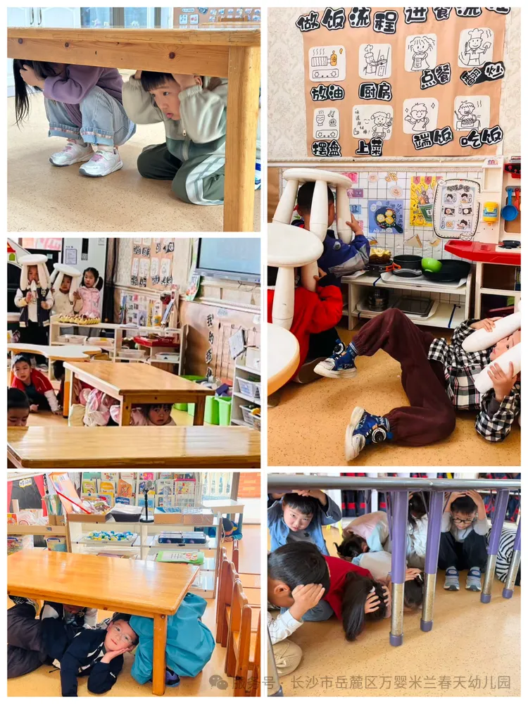 随着演练警报响起,防震演练正式开始。在老师的引导下,孩子们第一时间双手护头、迅速躲到桌下或教室安全角落,做好紧急避险。