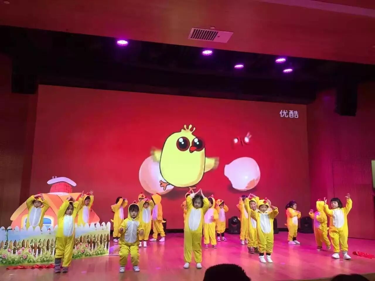 耶~快看,舞台上来了一群可爱的小鸡,他们在干什么呢?