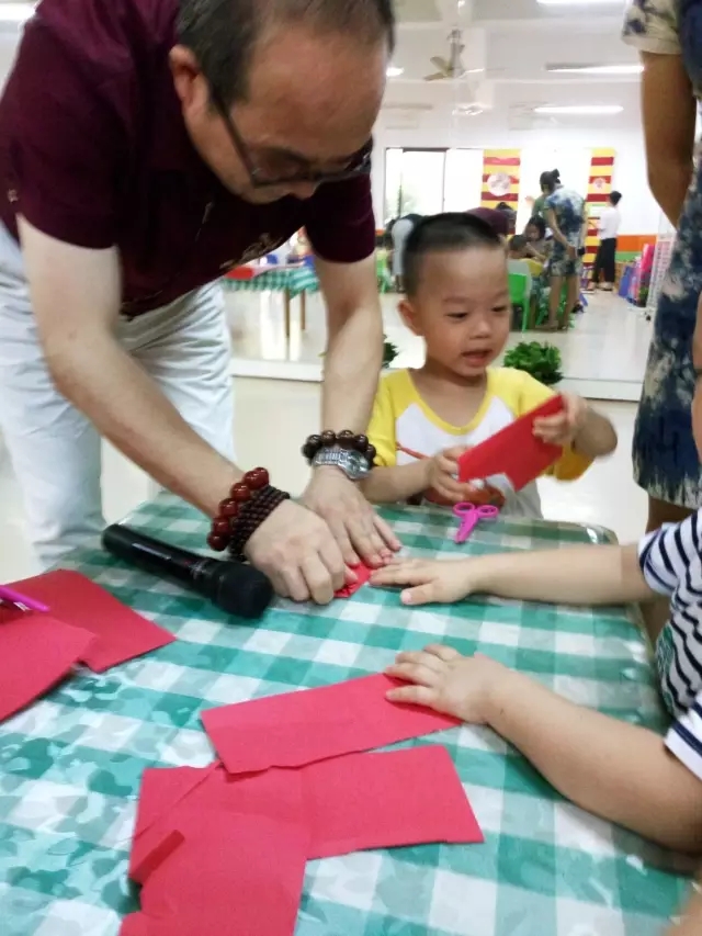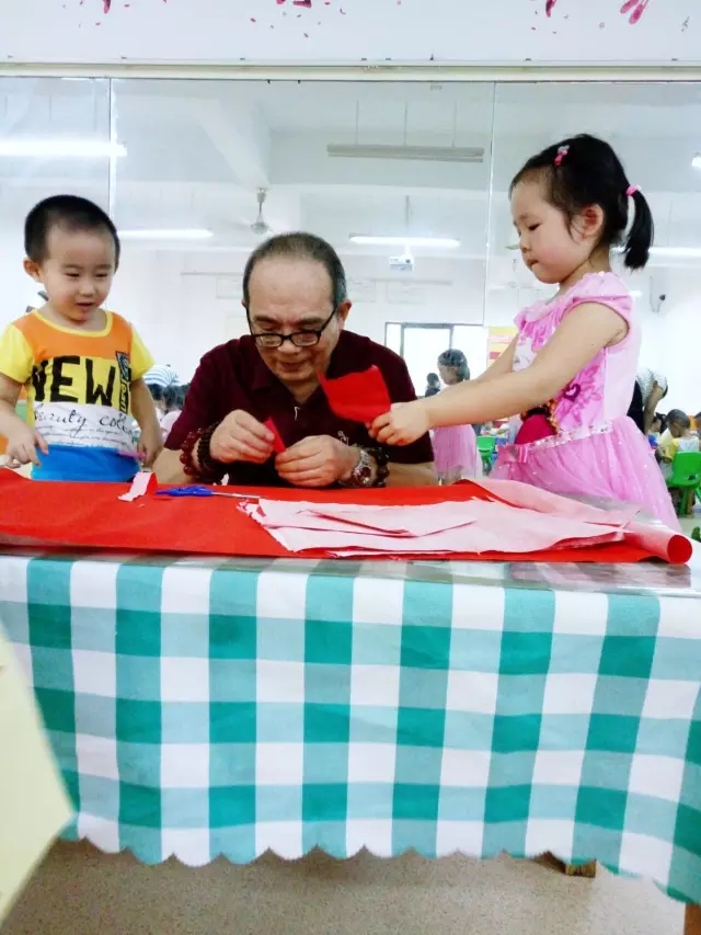 在教授孩子剪纸过程中,洪源老师特意避免使用专业名词,而是用孩子听得懂的语言悉心讲解。对孩子满满的爱意充分地流露了出来!万婴幼儿园的宝贝们都亲切地唤他“洪爷爷!”