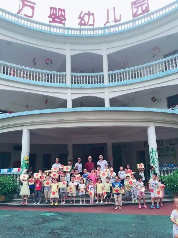 将纸打开,闪闪的红色五角星就剪好了,宝贝们轻松愉快的拿着自己剪好的五角星,纷纷来到我们的操场与洪爷爷合影。