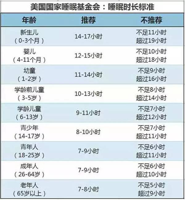上图中显示,学龄儿童前儿童应该保证10~13小时睡眠,学龄儿童应该每天保证有9~11小时的睡眠。因此,孩子最佳的睡觉时间是晚上8点半,最迟不能超过9点。早上起床的时间最好是7点以后。
