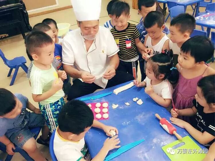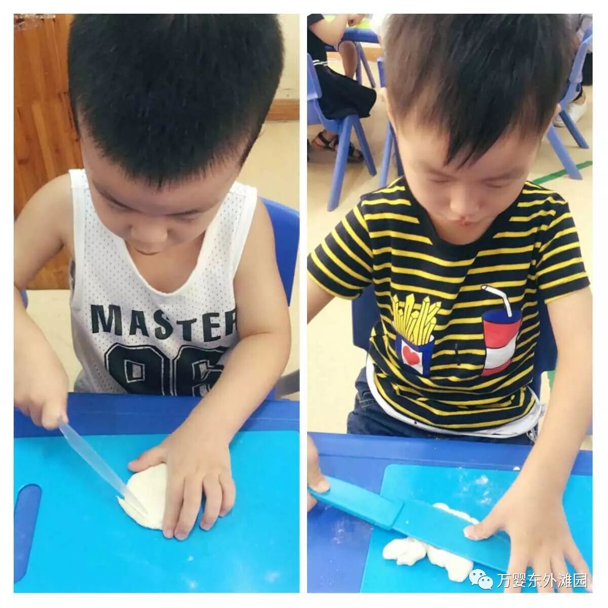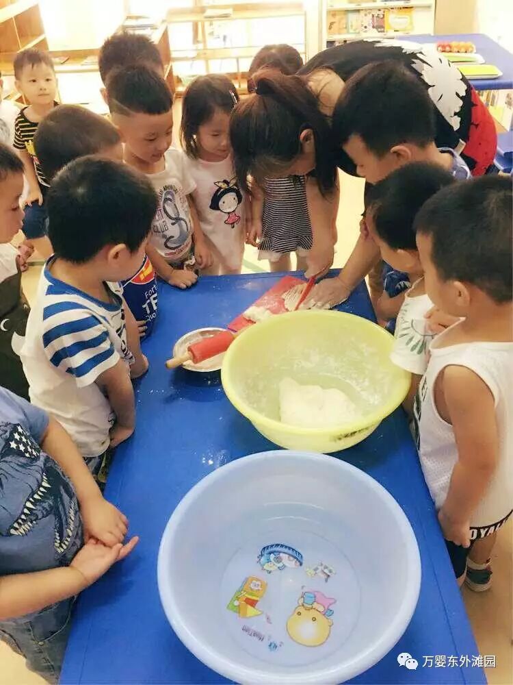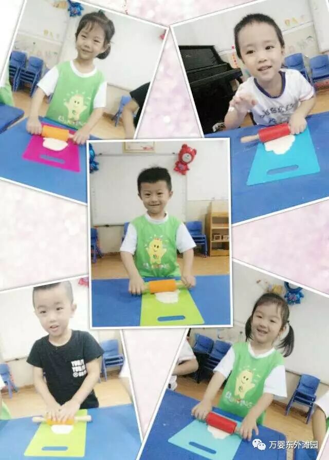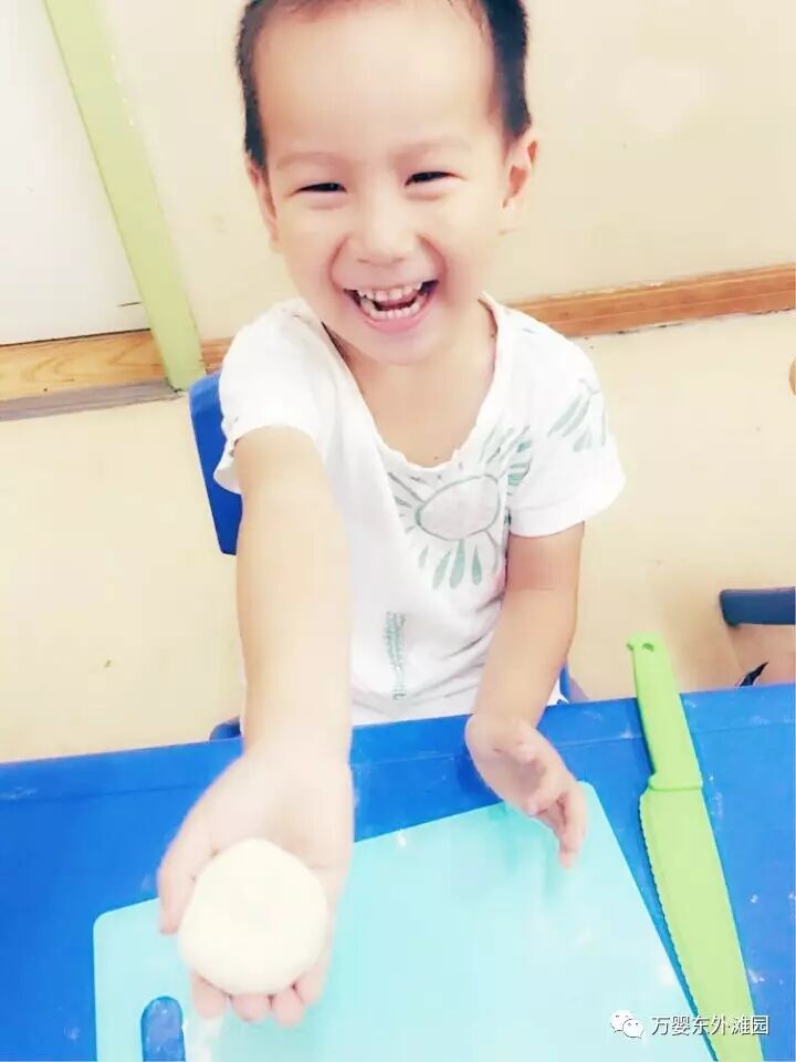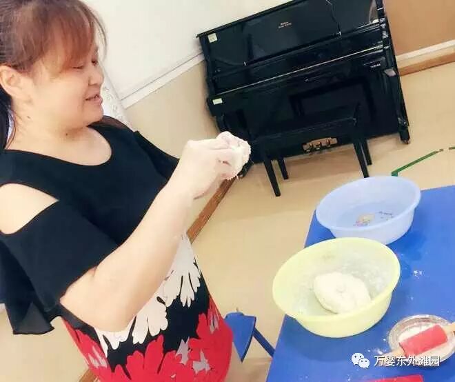 胡妈妈告诉我们,第一步要和面,因为面粉宝宝要喝水了!我们都仔细认真的观看着,当面粉变成面团我们就可以动手了。