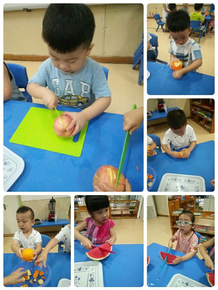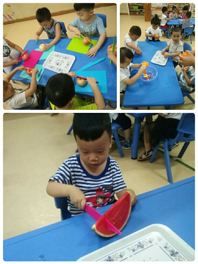 今天万婴东外滩园阳光之家的宝贝们讨论最多的是话题是:今天我带了什么水果?