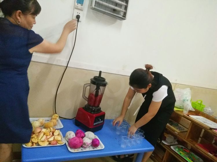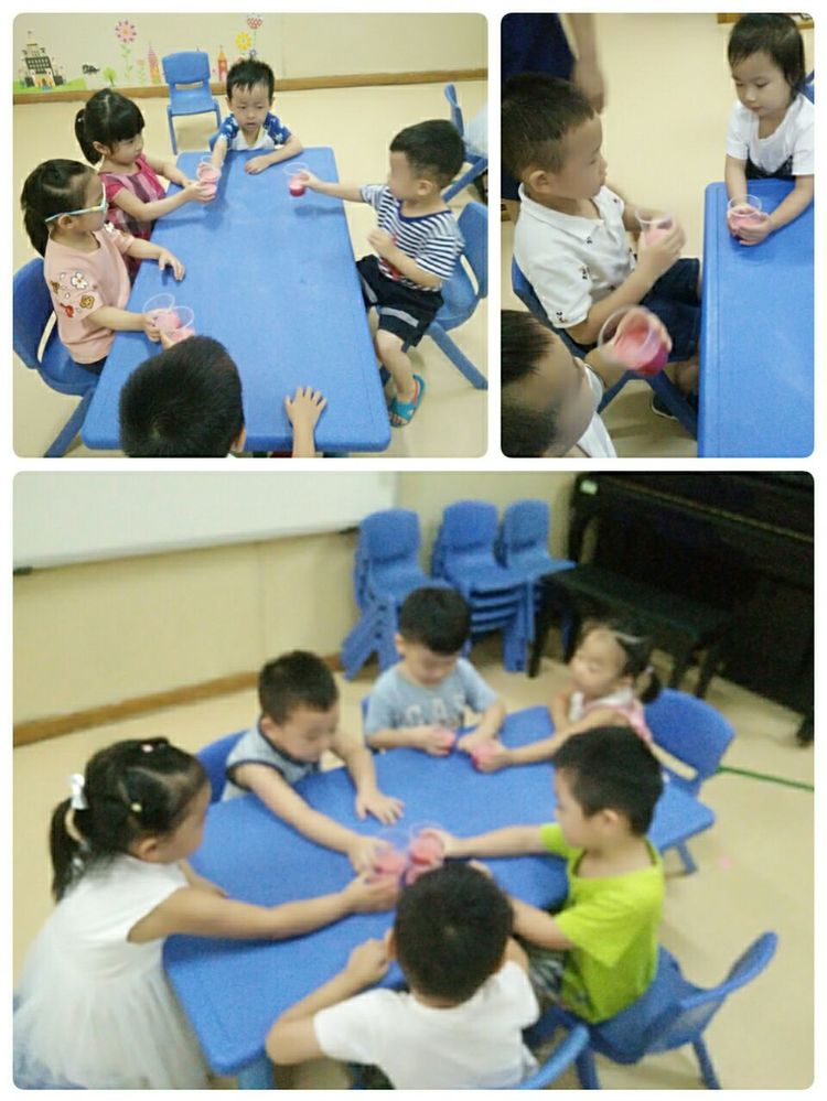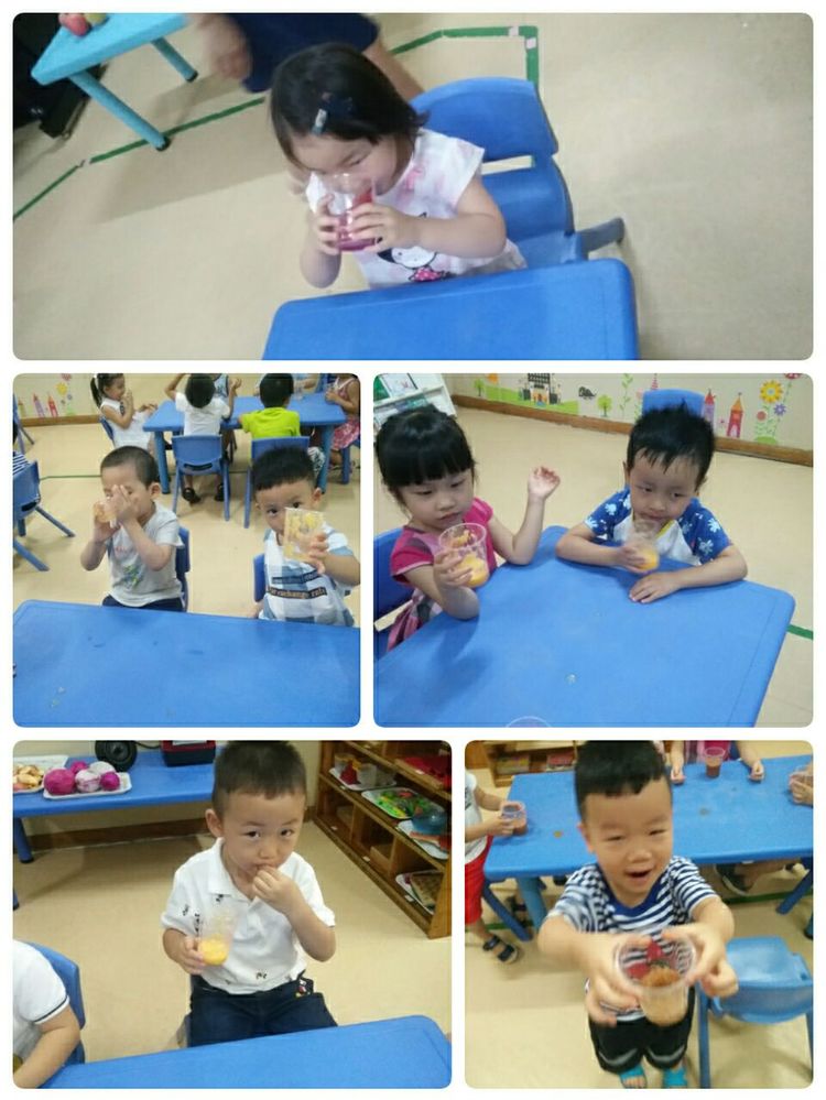 这次的“榨汁之旅”不仅让宝贝们通过视觉、触觉、味觉认识、感知一些常见的水果,还知道了榨果汁的步骤。同时切水果也锻炼了宝贝的手眼协调以及大肌肉的发展。并且在果汁分享中发现果汁中的气泡,并且一起探索;也自主的代入角色表演,使之更加投入此次活动。这也是此次活动中孩子给我们的意外惊喜!