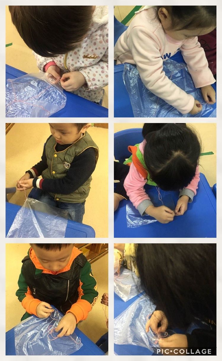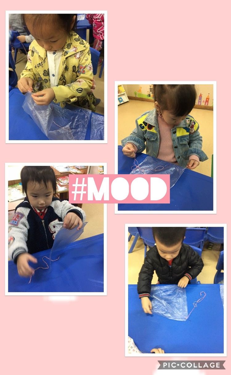 “哈哈,宝贝们都找到了,接下来就要考验宝贝的手指精细动作了哦!要把软软细细的绳子穿进洞洞里!”