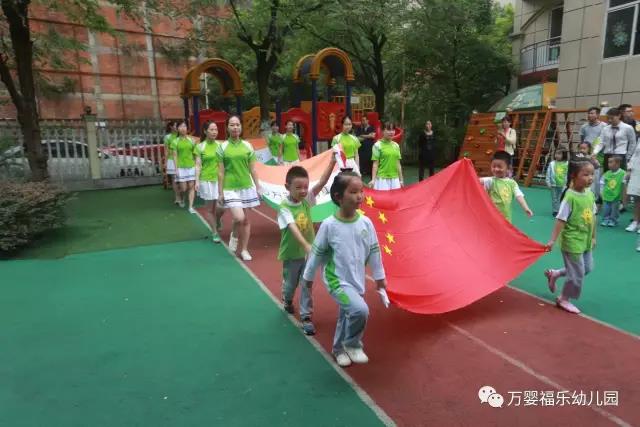 一步两步,昂首挺胸,迎面走来的是万婴福乐园的小小护旗手,紧随其后的是机构旗和园旗!——升旗仪式