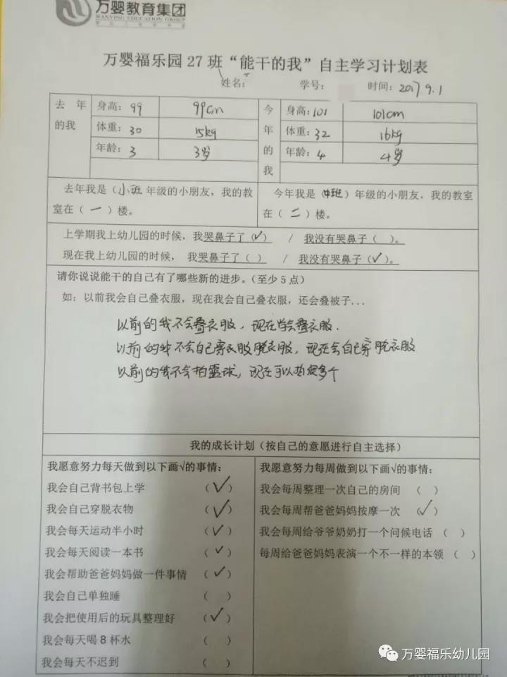 制作完计划表的第二天,很多小朋友就早早的自己背书包来幼儿园,第二天第三天仍是如此,到了第三周就有个别小朋友没有自己背书包了,我记得,每一个小朋友都在能自己背书包那一栏打✔,但为什么经老师提醒后仍然还是家长帮孩子拿着书包?我想:自己走路上学、自己背书包这么小的事,我相信每个孩子都能做到!希望家长能给孩子做自己主人的机会。