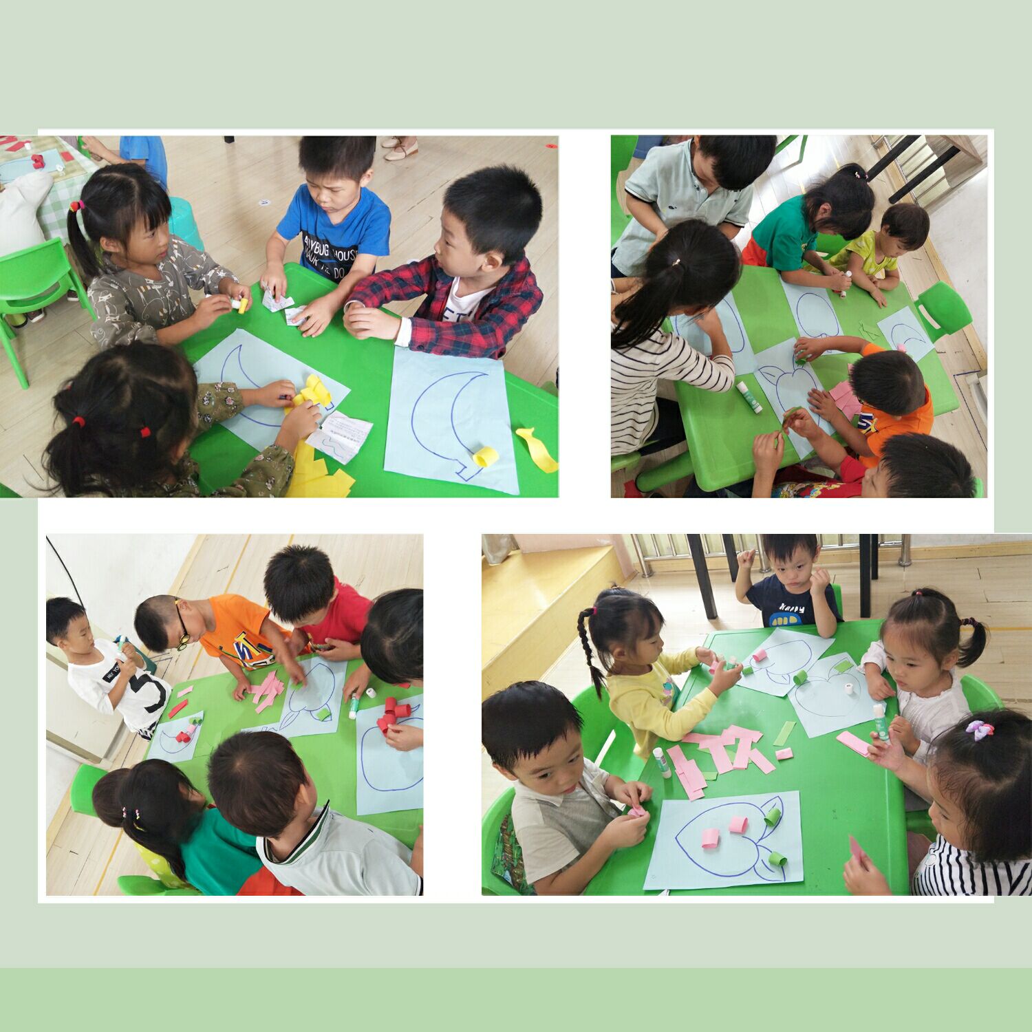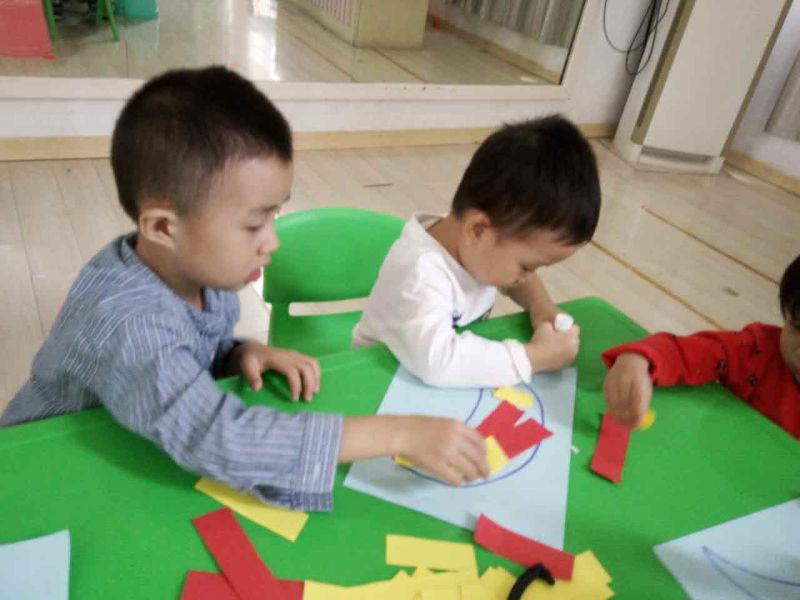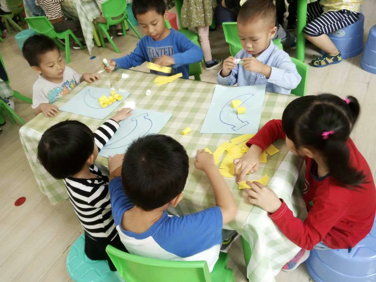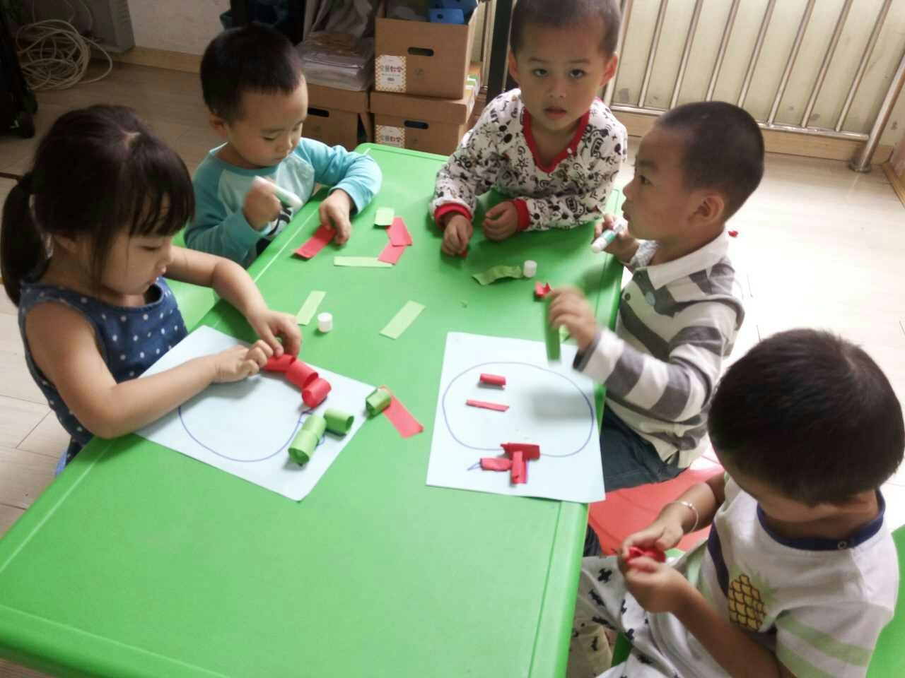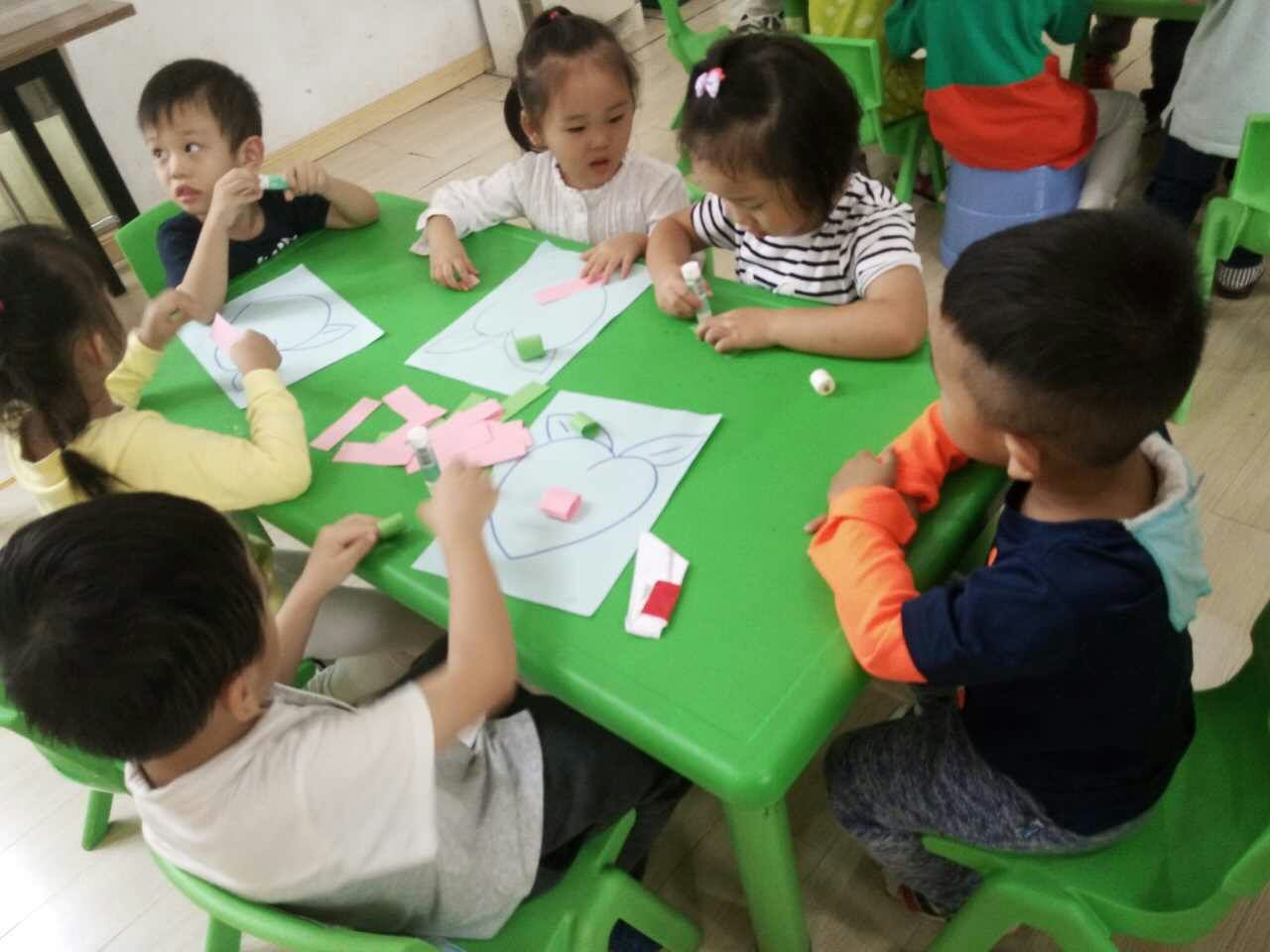 大哥哥姐姐细心耐心的与弟弟妹妹一起制作手工,给水果宝宝穿上新衣服。